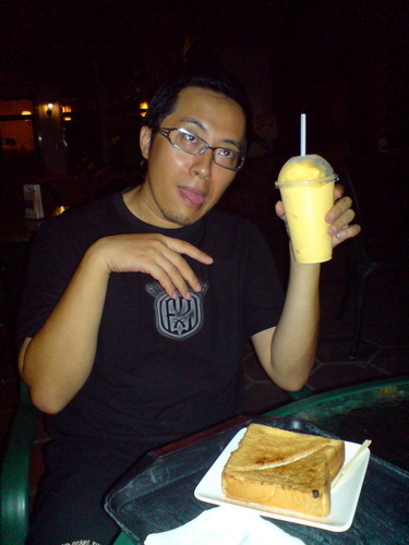 卡嚕爸又在耍寶了~ ( 他點了芒果冰沙、花生厚片 )