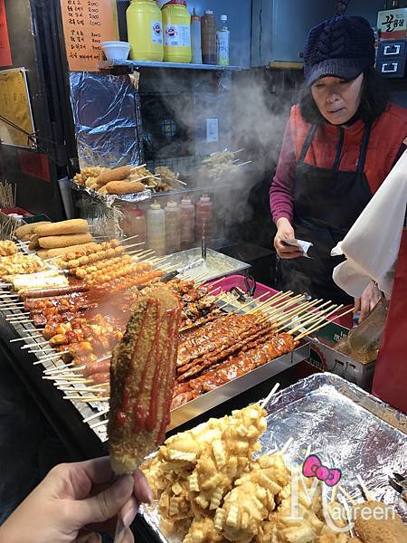 到韓國的第一天,抵達飯店(乙支路高爺商業公寓)安置好行李後已經是晚上快10點了,這時候連晚餐都還沒有吃的我,想說這麼晚飯店附近還會有東西可以吃嗎?走出飯店到附進晃晃後,真的覺得自己選對住得的地方了,外頭到處都還是人、店家幾乎也都還開著。因為肚子實在是太餓了,看到滿街路邊攤熱騰騰的美食就忍不住先來支大熱狗(₩2,000)啦!