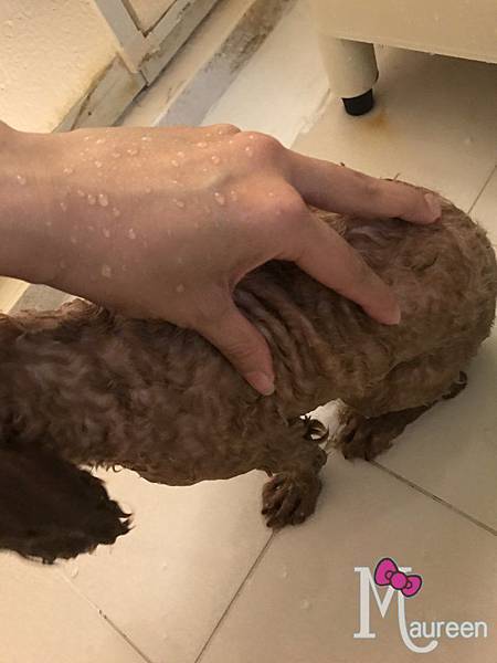將剛剛稀釋的護毛乳均勻的塗抹在哈妮身上,再充分的按摩一番,好讓皮毛跟皮膚吸收,等個3~5分鐘後再用清水洗靜就ok囉~~